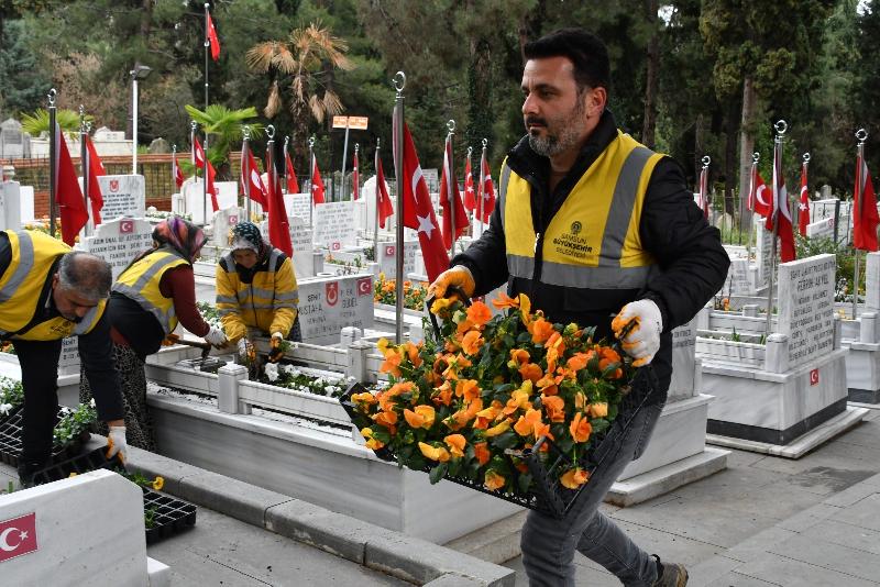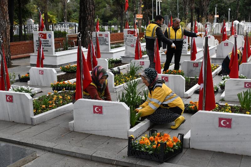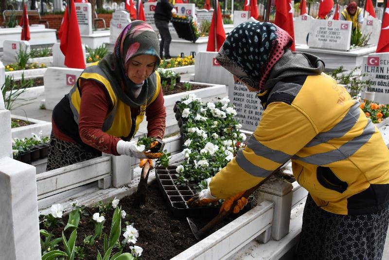 Büyükşehir Belediyesinden yapılan yazılı açıklamaya nazaran, ketteki şehitliklerde bakım ve paklık çalışması yapan Büyükşehir Belediyesi Park ve Bahçeler Dairesi Başkanlığı, mezarları çiçeklendirdi.