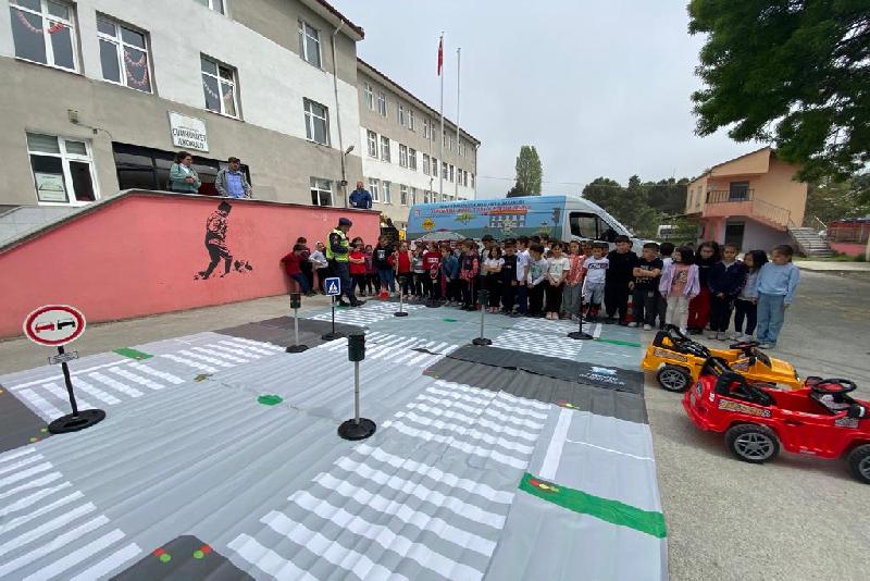 Okulların önüne kurulan trafik eğitim parkurunda akülü araçlarla uygulamalı eğitim de veren ekipler, öğrencilere trafik dedektifleri boyama kitapları hediye etti.