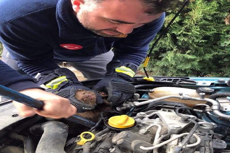 Ada Mahallesi'nde aracından ses geldiğini duyunca kaputunu açan şoför, motor kısmında bir hayvan bulunduğunu gördü.