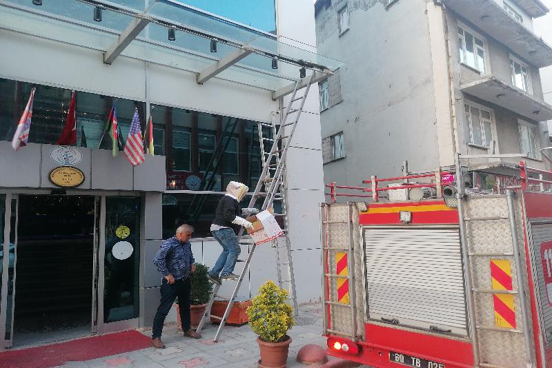 Gaziosmanpaşa Bulvarı Hızarhane Caddesi'nde bulunan bir otelin çalışanları, otelin girişindeki sundurmayı arıların sardığını gördü.