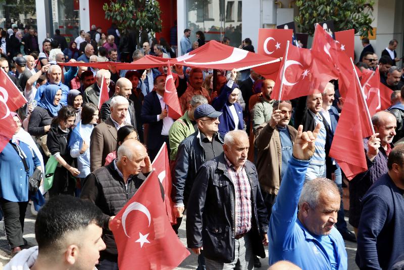 Ellerindeki Türk bayraklarını sallayan katılımcılar, Cumhur İttifakı cumhurbaşkanı adayı da olan Erdoğan lehine sloganları attı, vatandaşlardan seçimde destek istedi.