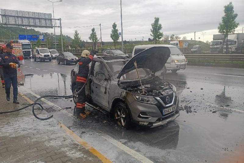 Sürücünün yol kenarına çektiği otomobilin motor kısmında başlayan yangın, kısa sürede aracı kapladı.