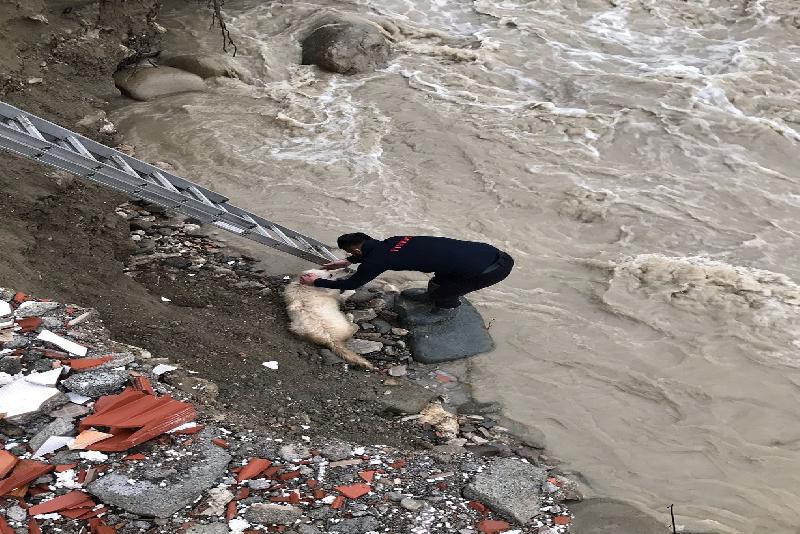 İhbar üzerine olay yerine gelen takımlar, merdiven yardımıyla çaya inerek köpeği mahsur kaldığı yerden kurtardı.