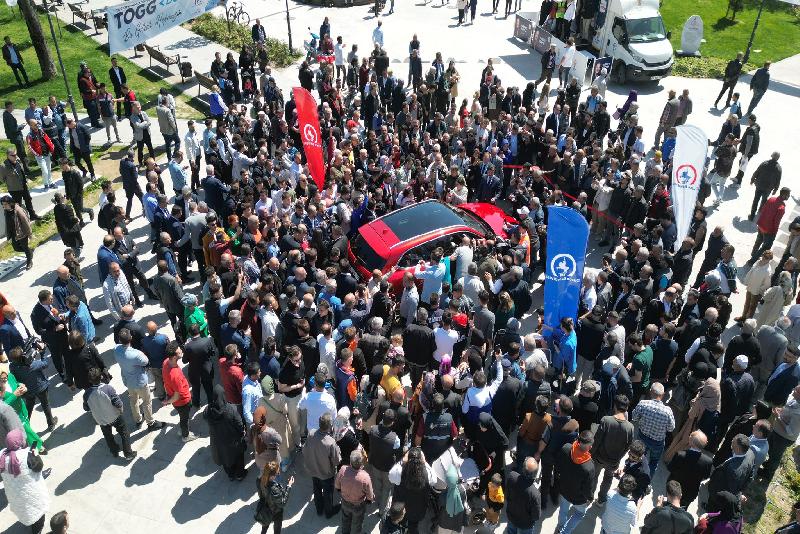 Düzce Belediye Başkanı Faruk Özlü, protokol üyeleriyle kent turu yaptıktan sonra Togg'u, Millet Bahçesi'nde hazırlanan tanıtım alanına getirdi.