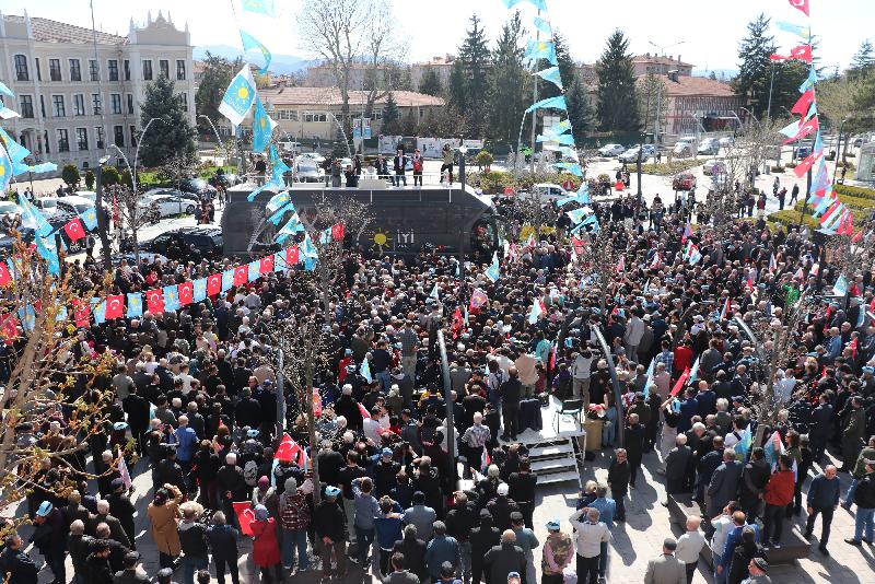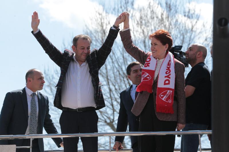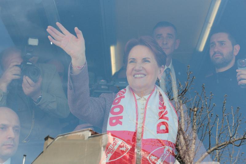 Akşener, Bolu Kent Meydanı'na geldiği parti otobüsünden partisinin Bolu milletvekili adayları Ahmet Örnekbaş, İrfan Bayar ve Suat Orhan'ı tanıttı.