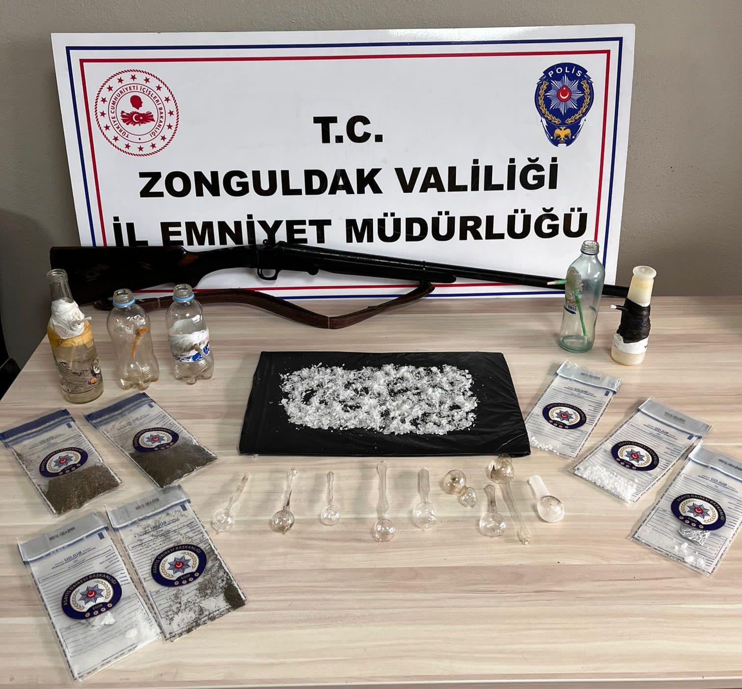 Edinilen bilgiye göre, Kdz. Ereğli İlçe Emniyet Müdürlüğü ekiplerince narkotik madde satışı yapan, temin eden ve kullanan şüphelilere yönelik operasyon düzenlendi. Narkotik Suçlarla Mücadele Grup Amirliğince ilçe merkezinde yapılan operasyonda 5 şüpheli yakalandı. Şüphelilerin üzerinde, ikametlerinde ve aracında yapılan aramada; 90 gram metamfetamin maddesi, 15 gram esrar, 15 adet uyuşturucu kullanma aparatı ve 1 adet ruhsatsız tüfek ele geçirildi. O.B., M.C., E.C., F.Ö. ve M.K. isimli şüphelilere işlem yapıldı.